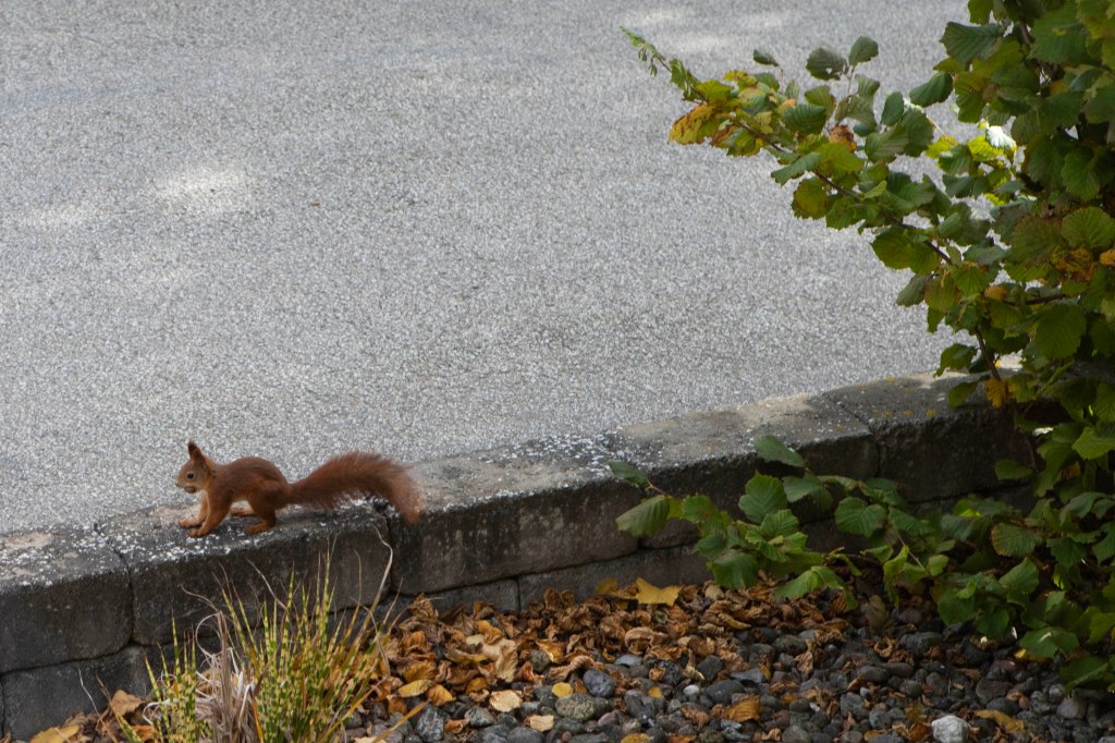 Den här lilla godingen kom och hälsade på häromdagen. Första gången jag har sett en ekorre här i vårt villaområde. Busken som står bredvid är en hassel så han var här och hämtade nötter. Efter det har jag sett honom några gånger till och då kommer han alltid för att hämta fler nötter. Jag fick ju skynda mig att fota honom genom köksfönstret 🙂