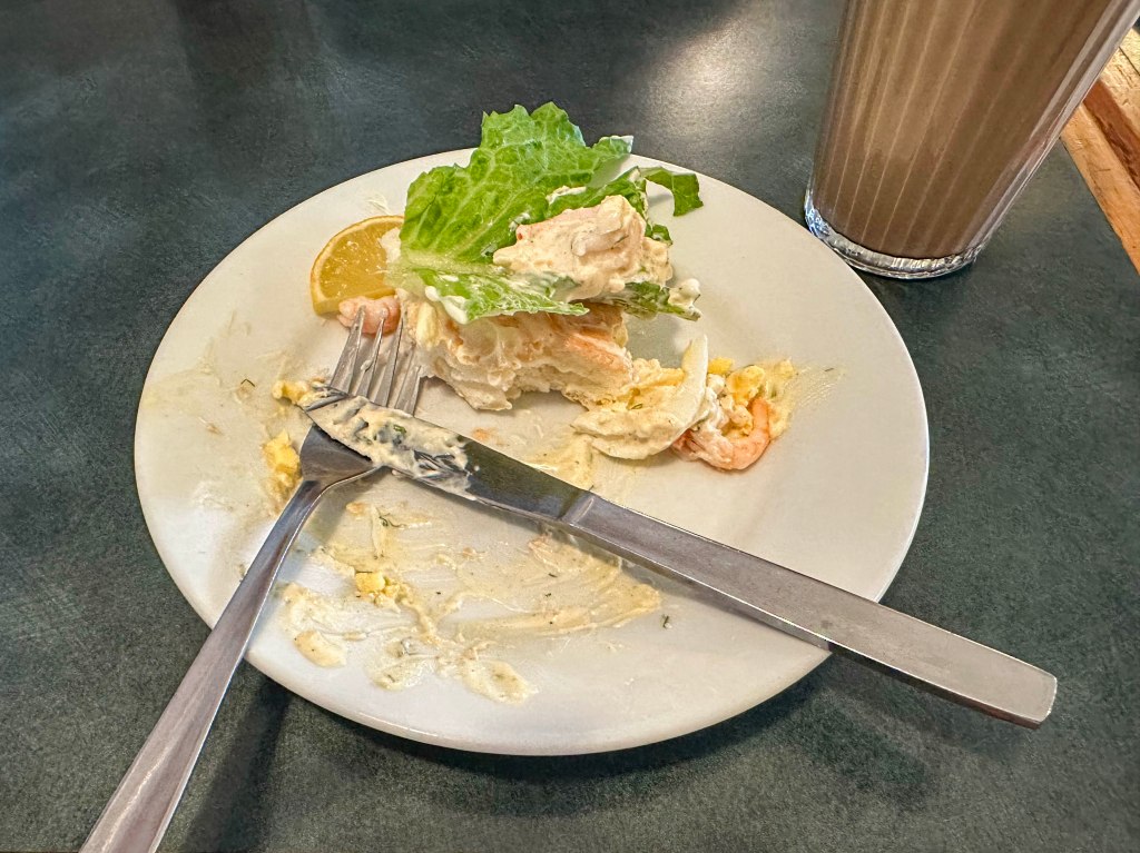 Jag åt en jättegod räkmacka men orkade inte äta upp sista biten.