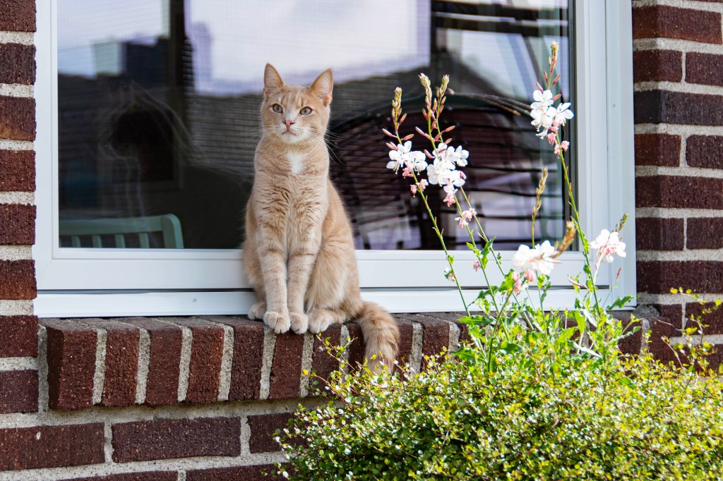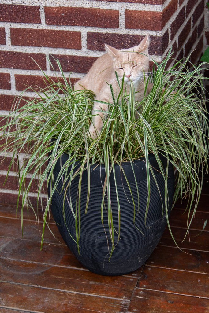 Här tronar Milo uppe i gräset i krukan. Det lär väl inte hämta sig på ett tag.