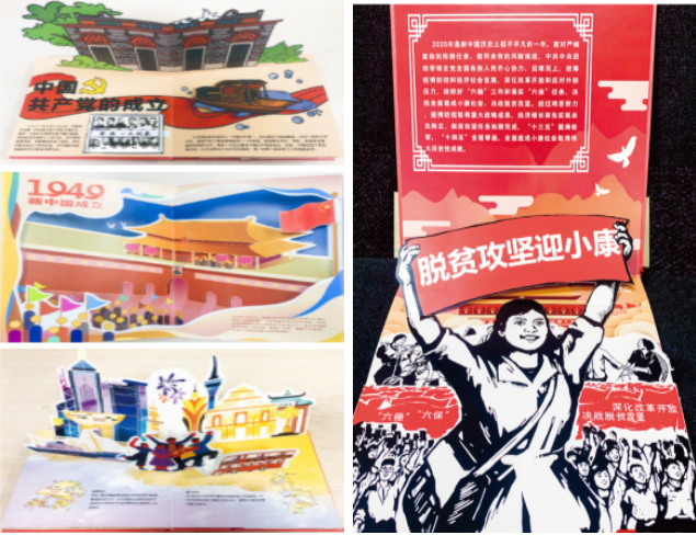 整本立体书历时4个月完成,选取了建党以来有里程碑意义的五件大事,从1921年中国共产党的成立、1949年中华人民共和国的成立、1978年召开十一届三中全会、1997-1999年港澳回归、2020年全面建成小康社会五大重要事件着手绘制,从多角度积极讨论研究,查阅书籍、绘制手稿、定版印刷、着手制作,将党史与专业艺术创作做到紧密结合。