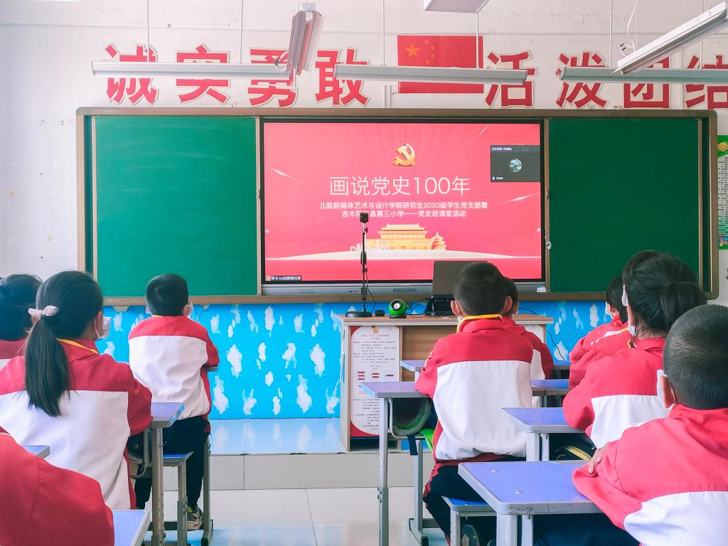 制作完成的立体书通过邮寄的方式寄到小朋友的手中,2021年4月21日下午,bv伟德研究生2020级员工党支部与新疆维吾尔自治区昌吉回族自治州吉木萨尔县第三小学的老师和五(7)班的同学们,通过线上视频会议的形式,开展了一场活泼生动的《画说党史100年》进课堂活动。在党史进课堂活动的现场,参与设计的党员用生动的语言向小朋友们讲解立体书每部分背后的故事并展示设计创意,让小朋友们在趣味阅读与动手实践的过程中增强了党史知识学习和理解。