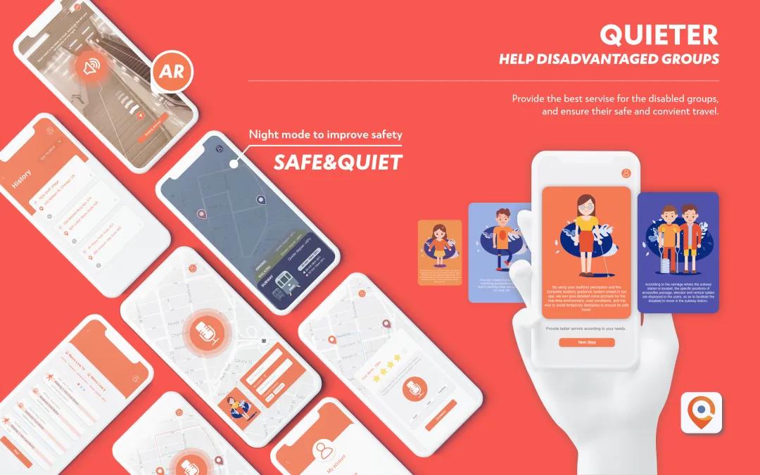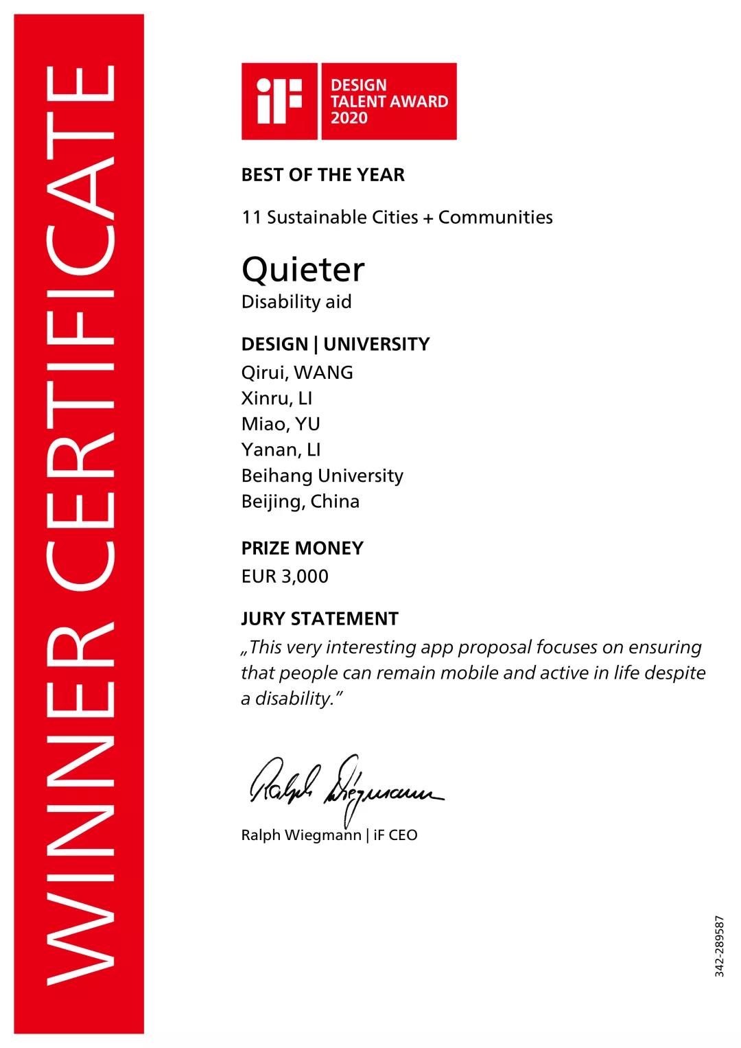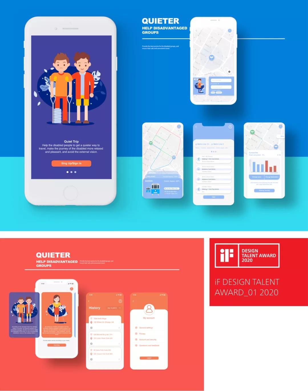 设计作品“Quieter”为其中的“可持续城市和社区(Sustainable cities and communities)”主题进行设计。该项目的目标是“到2030年,因公共交通系统的不断扩大,旨在为所有人(特别是弱势群体、妇女、儿童、残疾人和老年人)提供安全的、可支付的和可持续的交通系统方案,并改善道路安全。”该主题希望探讨设计在解决城市交通的可持续性和提高人类福祉中的相关价值。在全球超过一万件的设计参赛作品中,最终仅有7件作品荣获iF年度最佳奖(BEST OF THE YEAR)。公司bv伟德的本科生王麒瑞、栗歆茹、于淼、李亚男小组在众多参赛者中突出重围,斩获了年度最佳奖(BEST OF THE YEAR)并获得丰厚奖金。iF设计大赛(iF DESIGN AWARD)的评审团在其获奖评语中这样写道:“这个有趣的移动应用设计项目保证了残疾人在生活中的可移动的(mobile)能力和保持活动的(active)能力。”