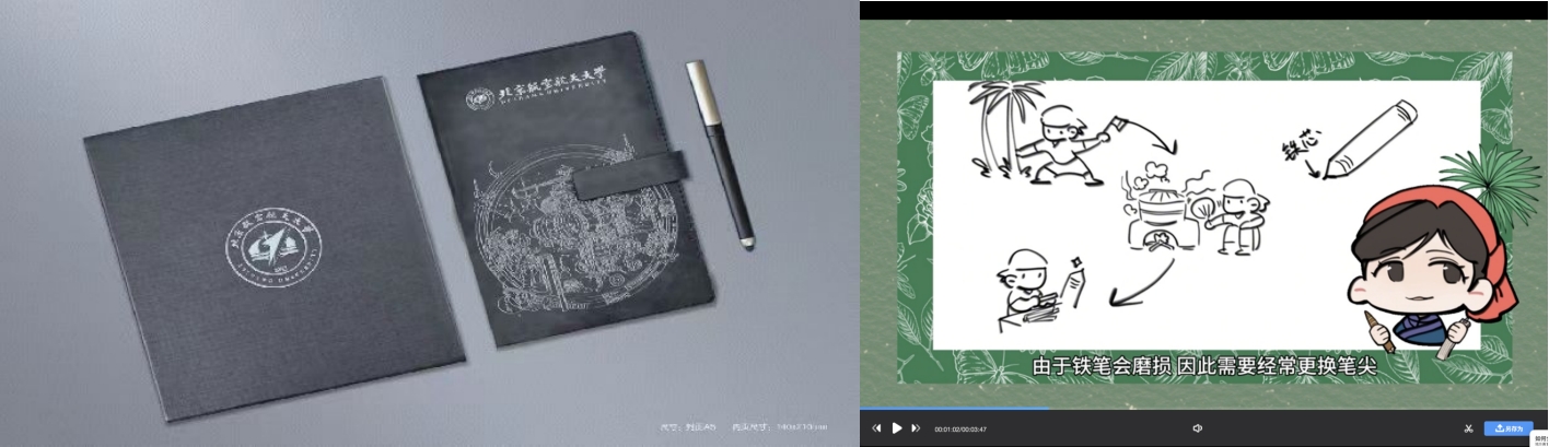 拾文思源实践队的队员们将实践过程中的所见记录下来,为非遗匠人、非遗产品进行视频宣传,全网视频浏览量36000+;此外实践队员们利用自己的专业优势,搭建线上展厅,融入北航元素制作非遗文创、表情包,如贝叶经手书动画、贝小叶表情包、傣陶项链等,让非物质文化遗产走入青年视野,融入青年生活,促进非遗与时代接轨。