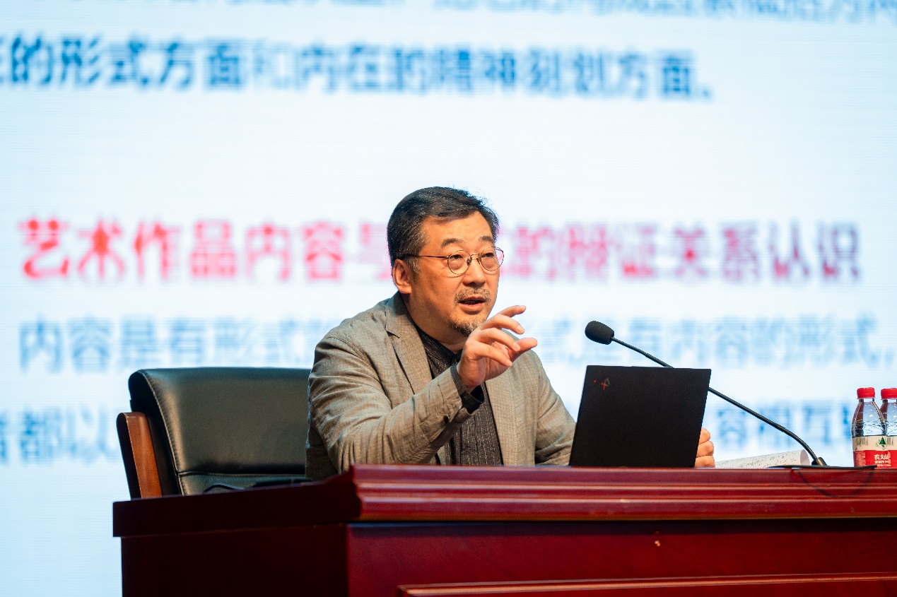 邹锋向师生们讲述了“用艺术设计创新讲好中国故事”中艺术设计的作用及具体实例,展示了题材与主题、形式与内容、展示与传播对于国家形象的设计展示、国家价值的凝练传播的作用。随后,邹锋以中华人民共和国成立70周年彩车设计,建党百年党史纪念馆雕塑创作,以及2022背景冬奥会休战壁画设计等艺术实践案例作为讲座的主线,通过大量的服务党和国家重大活动的艺术设计作品阐释了艺术与时代、设计与生活、创作与人民、展示与传播之间的相互关系。