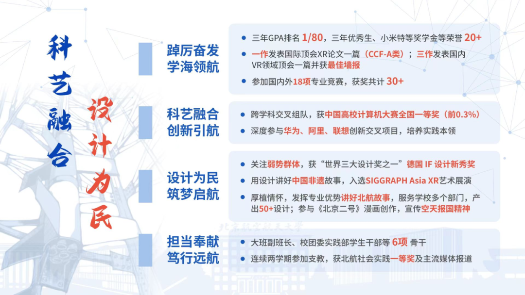 王雨同学始终坚持设计为民,以人民为中心,为更美好的生活而设计创造;科艺融合,与时代同步伐,为国家创新发展贡献北航设计力量!
