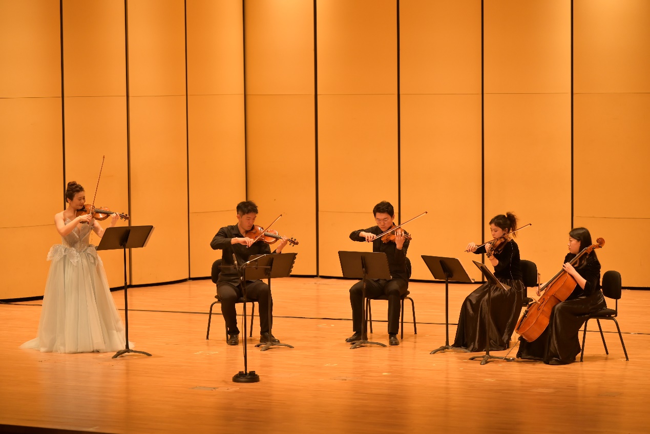 节目最后,两位老师合奏了《F大调小提琴奏鸣曲“春天”》第一乐章、《探戈的历史:1960》,并与特邀嘉宾中国广播艺术团大提琴二级演奏员郑昕宇一起演奏《电影之声》,给本场音乐会画上完美的句号。