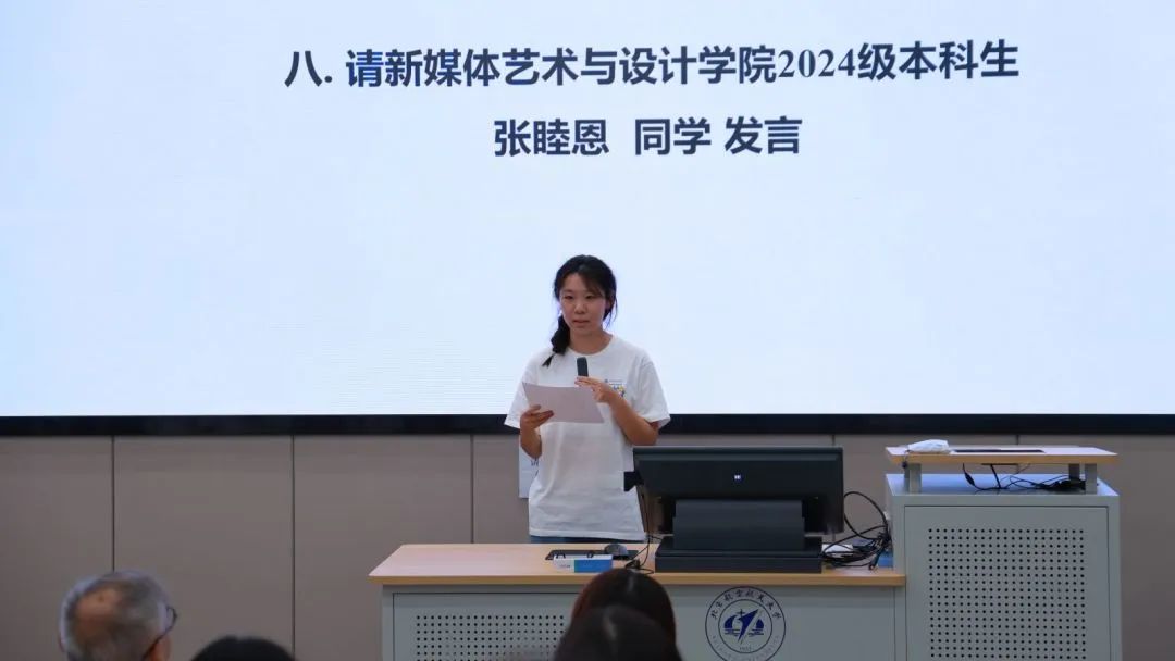 研究生新生代表潘盈宇同学则以自己的军旅经历为引子,鼓励大家珍惜校园时光,热爱校园生活,坚守北航校训,积蓄力量,以待未来。2024级本科生代表张睦恩同学则以诗词为引,深情地讲述了自己与美术、与北航的缘分,表达了对老员工活的憧憬与期待。