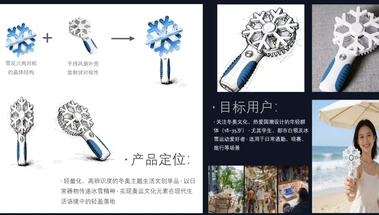 博士生王紫桐代表员工团队,系统展示了包括双生IP“雪腾腾&冰骁骁”在内的34件文创作品,涵盖IP形象、首饰设计、生活用品、非遗衍生、数字游戏等七大品类,全方位呈现了北航师生在传统与现代融合、科技与艺术共生方面的设计探索。团队在创作中充分考量年轻人审美喜好与消费习惯,在造型风格、品类选择上贴合当代青年潮流诉求,以年轻化表达吸引其关注与购买,同时巧妙植入中国传统文化、奥运精神及全民体育理念,实现文化传播与市场价值的双向赋能。其中,核心IP“雪腾腾&冰骁骁”以“雪如意”文化延续为核心,雪腾腾源自故宫太和殿脊兽“天马”,凸显向上奔跑的动感活力;冰骁骁借鉴金中都铜坐龙造型,经简化卡通化处理后兼具中式瑞兽气质与当代审美,实现了传统文化符号的创新表达。