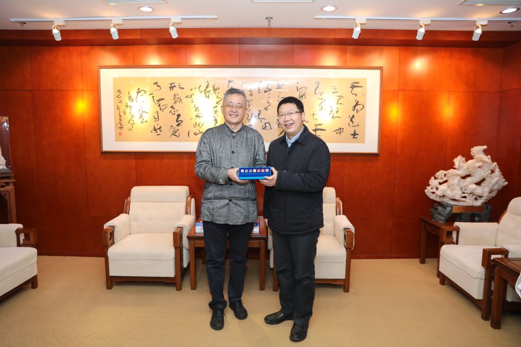 讲座前,吕卫锋副董事长向于海赠送美育中心参与设计的校庆70周年标识纪念徽章。