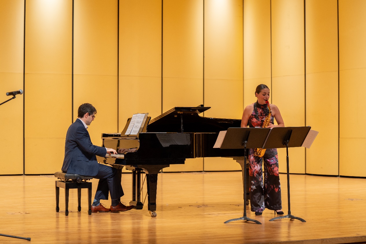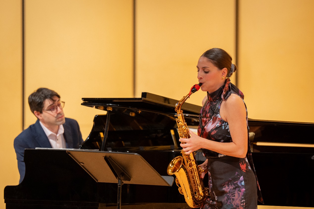 萨克斯演奏家克里奥·塞奥多里迪斯(Clio Theodoridis)和钢琴演奏家乔纳森·内姆塔努(Jonathan Nemtanu)为观众带来了一场精彩的室内乐演出。克利奥·塞奥多里迪斯作为斯德哥尔摩国际音乐比赛的铜牌得主,雅典 X.O.N 国家青年大赛的桂冠得主,以及第17届世界萨克斯大会的杰出获奖者,现场她向观众大胆展示了萨克斯无限变幻的可能性,令现场观众赞叹不已。乔纳森·内姆塔努作为加拿大魁北克萨格内音乐公司教授,曾师从多名著名音乐大师,并在多个国际比赛中获得殊荣,他的琴声美妙,又与萨克斯完美配合,精彩演绎了《美丽的夜晚》《回归巴赫》《红色赭石》等经典曲目。