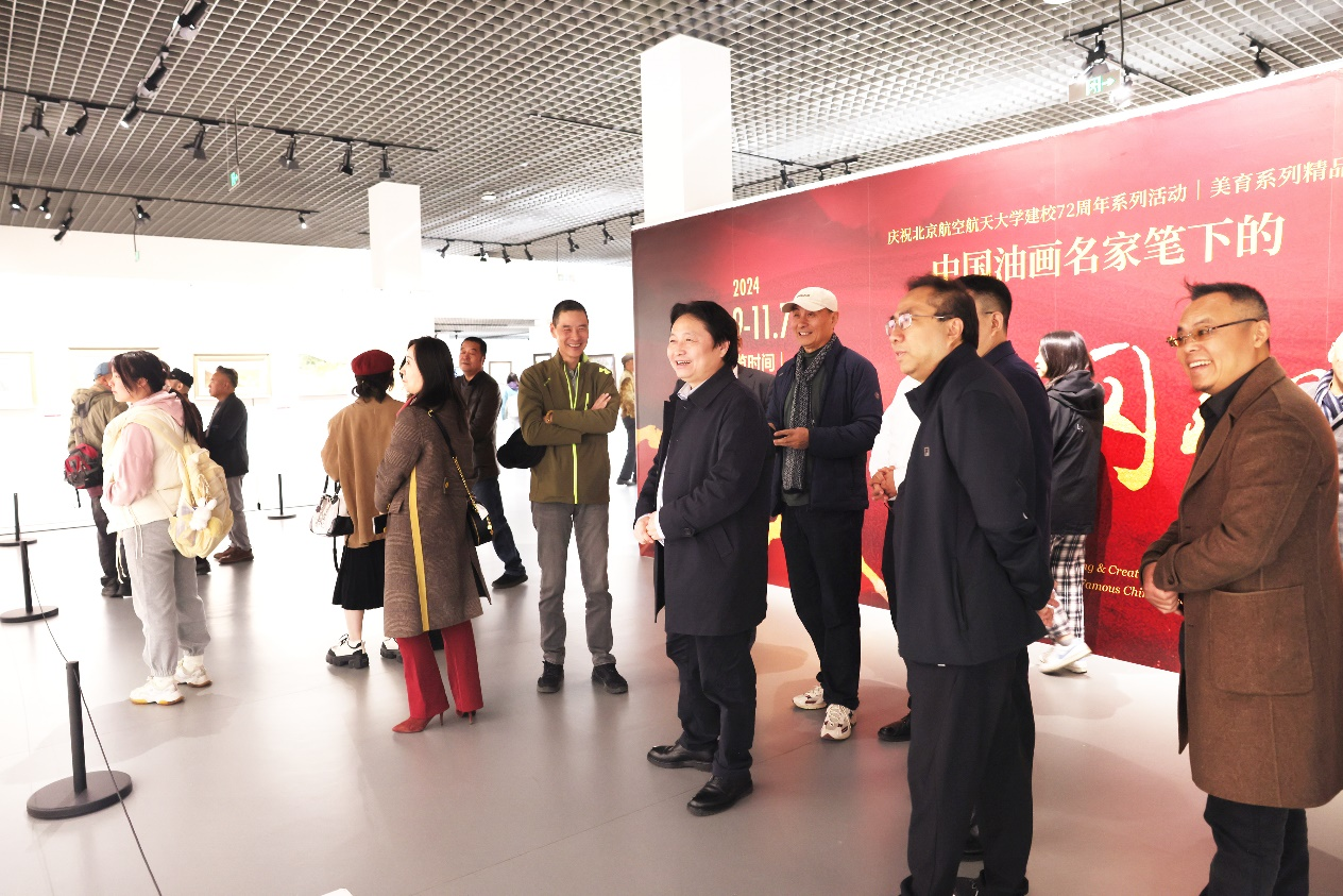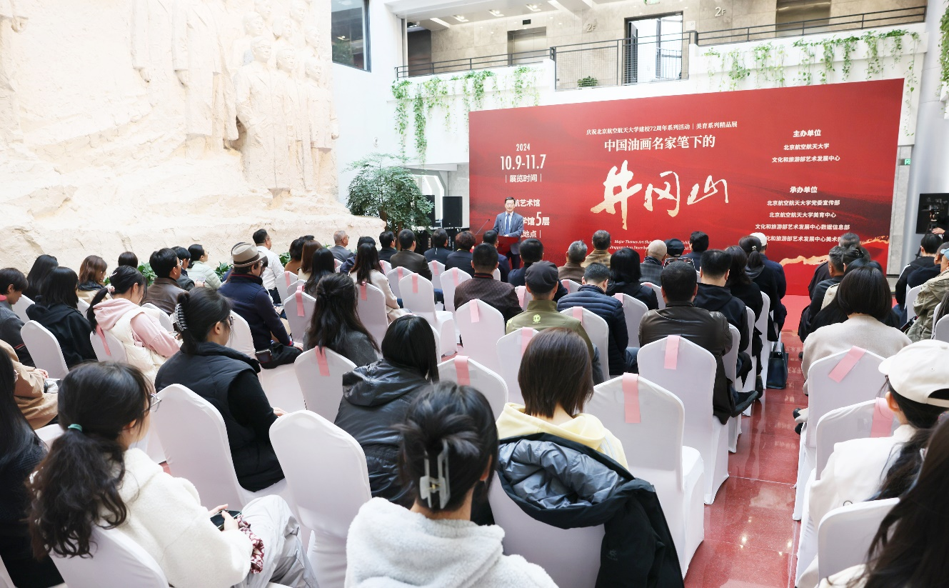 王云鹏对各位嘉宾的到来表示热烈欢迎,对文化和旅游部艺术发展中心的大力支持表示衷心感谢。他表示,今年是北航建校72周年,建校以来,公司始终传承红色基因,把服务国家作为最高追求,培养一流人才,打造国之重器,奋进在中国高等教育第一方阵前列。72载创业兴学,一代代北航人在砥砺奋进中涵育了爱国奉献的价值追求、敢为人先的魄力勇气、求真创新的科学精神、团结拼搏的奋进品格、担当有为的实干作风,形成了以“空天报国”为内核的北航精神。北航精神根植于听党话、跟党走的红色基因,井冈山精神承载着中国共产党人的初心和使命,二者薪火相传、一脉相承,都是时刻指引我们、鼓舞我们的“传家宝”。希望广大师生用好公司提供的美育资源,不断提升艺术修养,在展览中感受新时代油画家的创作成果和艺术才华,学习传承好革命文化,弘扬以“空天报国”为内核的北航精神,为建设中国特色、世界一流大学作出新的更大贡献。