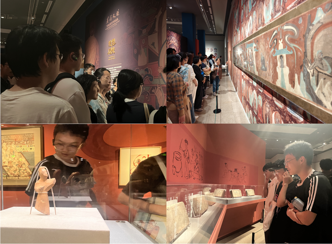 本次展览汇聚敦煌研究院、甘肃省博物馆等机构珍贵文物,涵盖彩陶、壁画、雕塑等多种类别。书院师生驻足于大师级敦煌壁画临摹作品前,感受千年艺术文脉的传承与创新,并在讲解员的引导下,重点观摩了“绘塑同光”展区中敦煌莫高窟复原场景、陶俑、木俑、画像砖等展品,学习如何鉴赏国宝,深刻感受到古代丝绸之路的文化交融与艺术创造力。