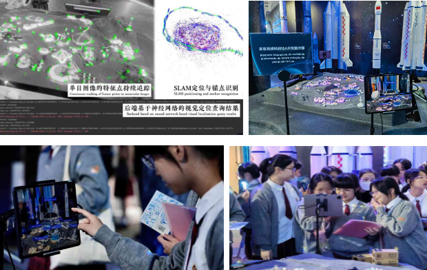 “未来月球科研站的AR互动沙盘”通过对实体沙盘采集图像并三维重建构建云端定位地图,前端设备实时采集图像发送到云端,实现前端AR交互设备的姿态定位与虚实注册,虚实融合地展示了未来月球科研站的规划蓝图,通过良好的UI、三维动画和交互流程用户体验设计,构建了完整、有趣的交互体验。