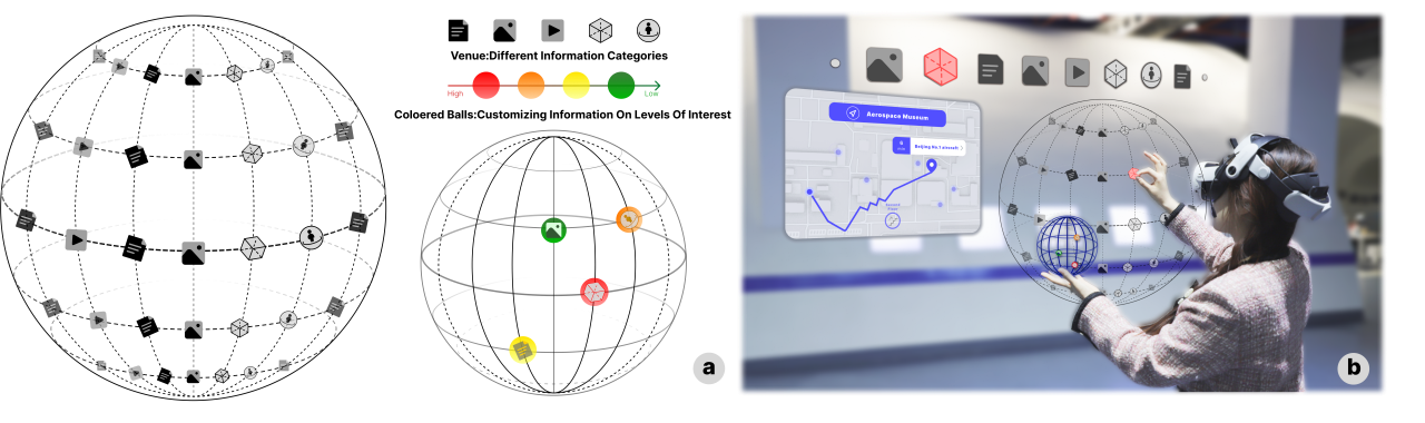 在本次Interactivity展示中,公司师生所展示的研究成果深入探讨了基于地球的信息显示优势与MR技术的融合应用。该成果突破了传统平面展示的限制,借助MR技术的虚拟现实优势,构建了专为博物馆和展览空间设计的3D多维信息显示和空间交互系统。该系统利用地球的经纬度描述作为信息组织的基础,结合球体特性设计了一系列创新的交互方法,旨在提升用户的空间感知和交互体验。这些交互方法包括激活、拾取、投掷、导航和跟随等,使得多个用户可以在同一设置中共享和协作,共同探索和学习。这一创新性的研究成果不仅为博物馆和展览空间的信息展示提供了全新的解决方案,同时也为人机交互领域的发展注入了新的活力。