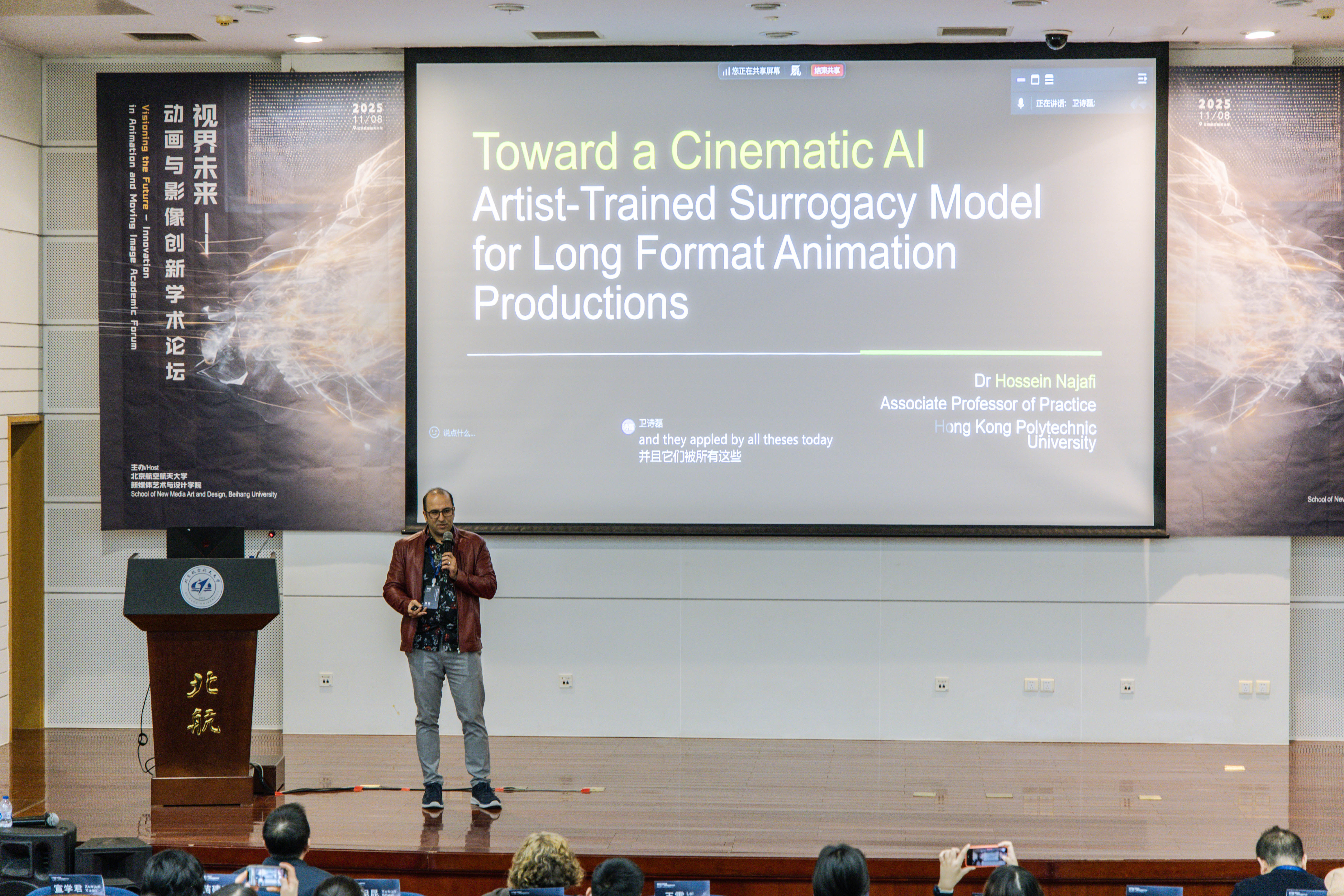 来自香港理工大学设计公司的Hossein Najafi博士带来的《面向长篇动画制作的电影级经艺术家训练AI代理模型》Hossein Najafi博士提出以艺术家专属数据集为核心的AI协作模型,以应对AI影视制作中的角色一致性、影像控制、声音设计及后期等十大挑战。该模型通过可引导、可迭代的流程管线重现传统动画与特效制作机制,并在艺术家与工程师的共创中,重新定义AI的创作代理角色,推动动画迈向电影化的生成方法论。