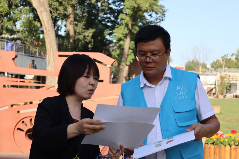 参观结束后,新媒体艺术与设计公司党委副书记董萍萍老师与在光明里社区党委张书记、1897科创城王老师交流此前参观的调研成果,并赠送了由支部党员设计的手绘明信片、1897二七厂科创城地图、手绘建筑贴纸等相关文创实物。