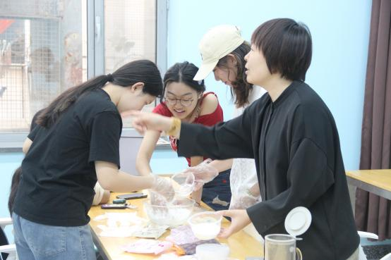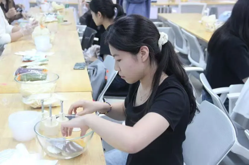 “原来揉冰皮要掌握好力度,才能让月饼皮更细腻!”“这个玉兔造型的模具太可爱了,我要给家里孩子做几个!”活动现场氛围热烈而温馨,师生们热情高涨,纷纷动手尝试。有的教职工专注地捏制冰皮,小心翼翼地包裹馅料,确保月饼造型完整;有的则发挥艺术创意,用不同颜色的冰皮搭配出渐变效果,或是在月饼表面印上“中秋快乐”“艺院同心”等字样,让小小的月饼承载满满的心意。不一会儿,一个个造型精致、色彩诱人的冰皮月饼便新鲜出炉,大家拿着自己的作品拍照留念,脸上洋溢着成就感与幸福感。